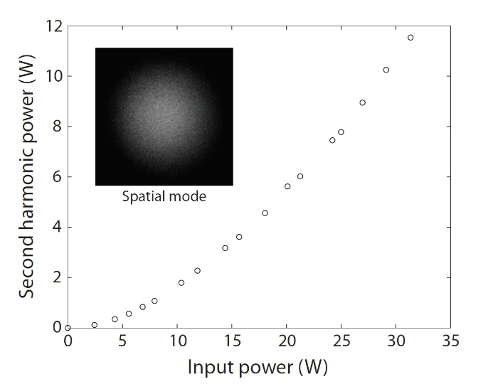 ANU’s Quantum Sensors and Atom laser Group demonstrated an 11.4W narrow linewidth laser source [1]. Using a 30W 1560nm fiber laser in a single-pass frequency doubling scheme, Sané et al. achieved a 6kHz linewidth 780nm laser with 36% efficiency. This corresponds to an efficiency of 0.3%/Wcm (in a low gain system, you can typically achieve 0.6%/W/cm), and the maximum input intensity to the crystal is 500kW/cm2. The system was run for over 2200hrs of operation with no reduction in power. The SHG output power is shown in Fig. 1, with an inset showing the spatial mode of the 780nm light. The 780nm source is measured to have a linewidth of 6 kHz integrated over 100ms.