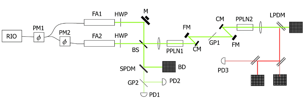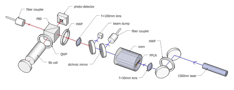 The optical setup of the laser system is shown in Fig. 2, with the 30W 1560nm laser, MgO:PPLN crystal, and Rb cell for locking the seed laser. A standard MSHG1550-1.0-40 was used as the SHG crystal, heated in a PV40 oven with an OC1 temperature controller. The crystal parameters and focussing conditions used were: