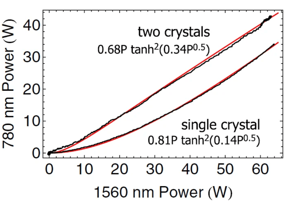 Figure 3: Measured output power from cascaded MSHG1550-1.0-40 crystals (red).